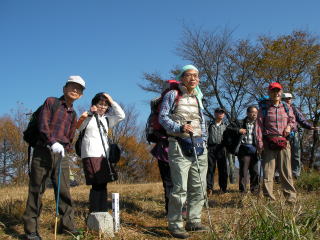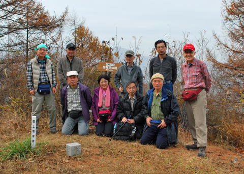 林道を何度もショートカットする登山道で、鉄砲登りが続く。赤松が多く松茸山であり、入山禁止の表示があちこちにある。三つ目の林道で休憩。四つ目の林道は東屋がある。幅広の道を直登してから、山腹を巻くように左に進んだが、これが間違い。引き返して尚も直登して尾根に登り、左に急坂を登れば山頂に着く。山頂からは北方が開け、子壇嶺山が見える。天気予報では高気圧が本州の真ん中に着て良い天気の筈だったが、曇り空で遠望は効かない。山頂は我々だけで、ゆっくり昼食にする。