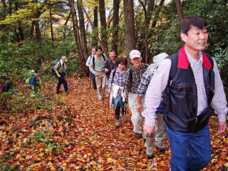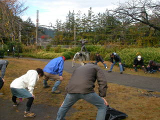 宮ノ平駅前の集合時に、杉山さん、橋本さん、門馬さんがいないので気になったが、宮ノ平を乗り過ごしたとのことで、間もなく上りの電車で来る。参加申し込みのあった市川さん、杉沢さん、中嶋さんが不参加で、参加者は17名。橋本さんの指導でストレッチ体操をして出発。