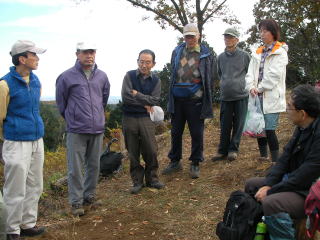 登山口手前で休憩し、薄着になる。今日は気温が高め。この先の民家では何頭もの犬が飼われていたが、今回は何故か犬小屋のみで犬は一頭もいない。緩く登り、尾根に出る。尾根では南面に出て休憩。約七ッの小ピークを越えて尾根を進み、分岐でザックを置いて天狗岩に行く。天狗岩では殆どの人が鼻に相当する周囲が切れ落ちた岩稜に下りる。曇空ながら雨上がりのせいで視界が良い。頭の部分に集合して記念写真を撮る。分岐まで戻り、赤ボッコで昼食休憩。ここでは、新宿副都心を始め池袋や横浜の高層ビルが遠望でき、更に東京スカイツリーも視認できる。食後に輪になって全員が自己紹介をする。その後、重富さんと鈴木さんに馬引沢峠と二つ塚峠の民話のプリントを読んでもらう。記念写真を撮って出発。