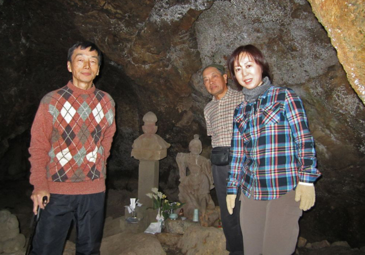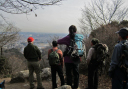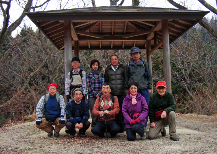 弁天洞窟では交代で全員が中に入る。昨日まで冬晴だったが今日は生憎の曇空で、弁天山から遠望は効かず、眼下に山田大橋やイオンモールが見える程度だ。佐々木氏が中嶋氏に電話するが、歩いているようだ。しかし、この後は電話が通じない。網代城山では葉が落ちた広葉樹の間から昨秋歩いた長淵丘陵が見える。車道に下り、左上の前山公園を歩き、小峰公園に入る。八坂神社を経由して桜尾根を登り、北方の展望が得られる東屋で昼食。今日は卯年の新年山行でもあるので、全員でジャンプした写真も撮る。