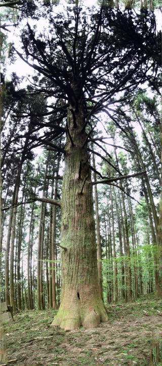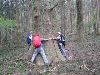 ずーっと登りが続いていたが、少し開けた場所に到着する。そこには大きな杉の木が手を広げて待ってくれいるようだった。ここが大杉の広場である。皆で手を繋いで幹の太さを測ってみと、4人で片腕が余るほどという、大木であった。