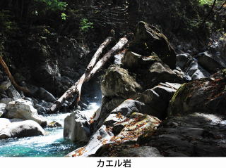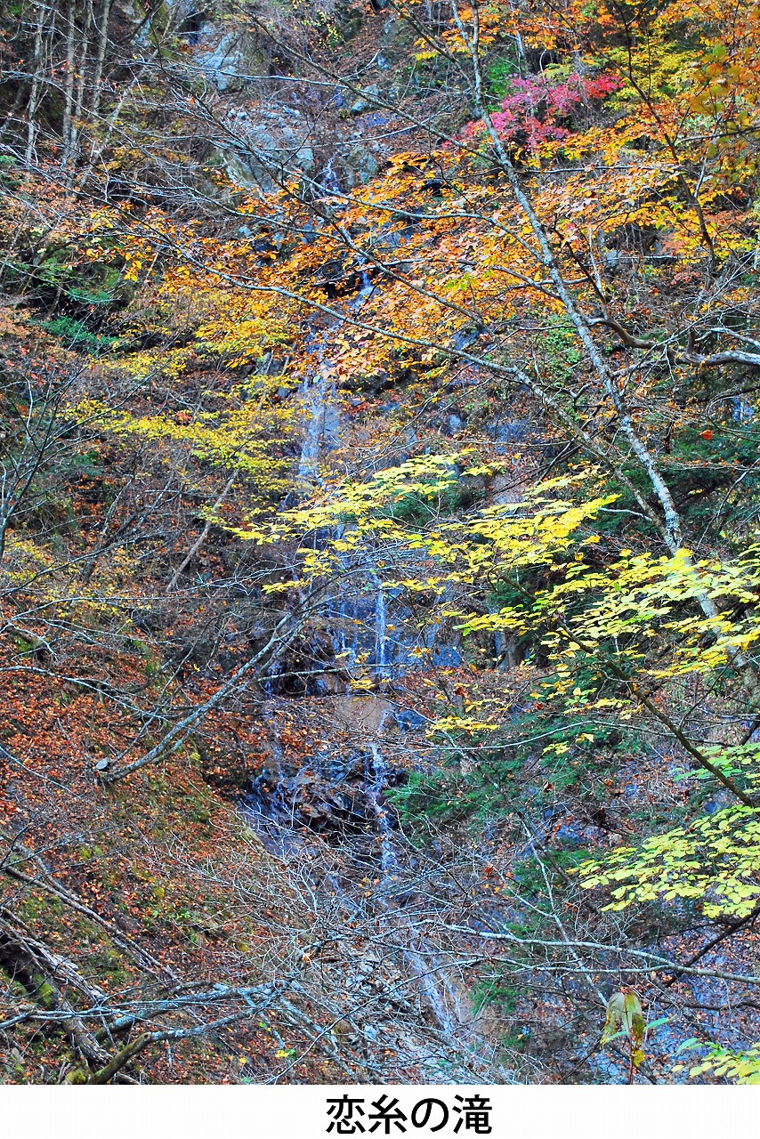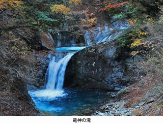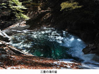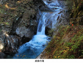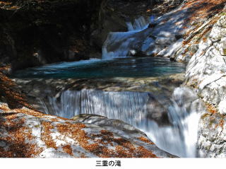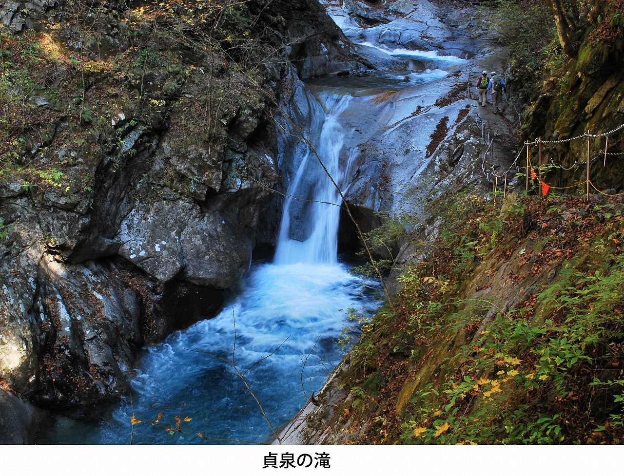 甲武信岳登山入口を過ぎ、10.08最初の滝、大久保の滝(大久保沢の滝)に出会う。この後、三重の滝、竜神の滝、恋糸の滝、貞泉の滝と滝の連続である。滝壺のエメラルド色が美しい。また、フグ岩、人面洞、母体淵、カエル岩などの見所も続く。