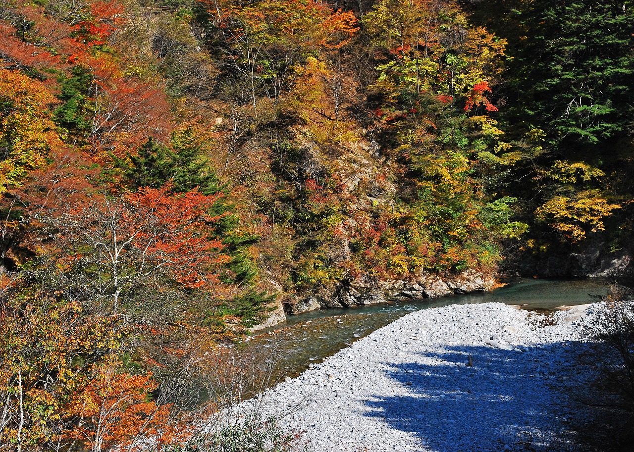 9.20出発。もみじやかえでの紅葉が栄える秋晴れの青空の下、青く透明な笛吹川の清流沿いの道を進む。