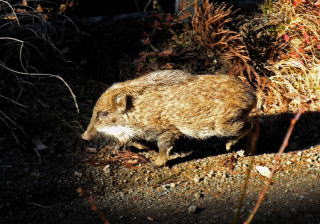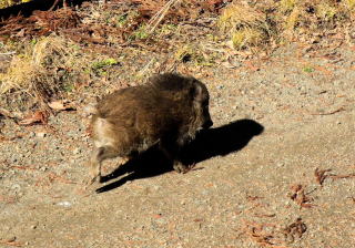何と我々の前に小動物が現れた。逃げるでもなく、先導してくれているかのようである。さてその小動物は何、後姿だけで定かではない。イノシシ、狸、それとも犬と思いながら登って行くと、林道に出る。小動物は林道へ、我々は林道に沿った山道へと別れる。その小動物が林道を行ったり来たりしているのが見えた。間違いなくイノシシで、顔は厳つく、たてがみもあるがどうも子供のようである。水たまりの水を飲んだりしていて、あまり恐れる様子もなく、親からはぐれたのかもしれない。野生のイノシシをこんな間近に見ることができたのは初めてであるが、こんなに安心して見ていて良いものだったのだろうか。
