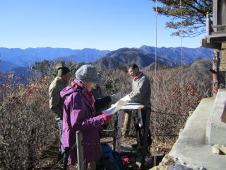 冬山の昼食は、結構体が冷えてくる。更に風が冷たくなってきた。早々に昼食を済ませ頂上を目指す。頂上は意外と人陰も少なく、暖かい。そして見晴らしが素晴らしい。目の前には、先日登った、両神山や雲取山、そして武甲山など四方を見渡すことができた。