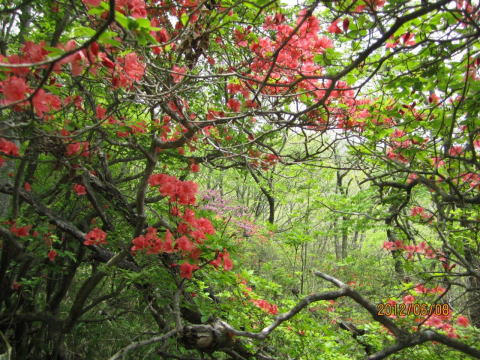 の登山者ばかりが目につく。我々は帰りのバス停と時間を確認して気を取り戻して歩き始めた。山道はいたるところ階段状に土留めがされており、とても歩きやすい。荒山全体がツツジでおおわれているが目立つのはうす紅紫色のミツバツツジ、オレンジのヤマツツジだ。新緑に映えて美しい。同じツツジでも開花時期にバラツキがあるのもおもしろい。咲き散っている木もあればまだ蕾みだけの木もあり、陽あたり、風の影響かと考えさせられる。それだけに訪れる者に長く楽しませてくれる。