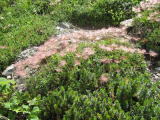 頂上近くにお花畑があり、シナノキンバイ、ピンクのハクサンフウロ、モミジカラマツなどの群落が迎えてくれた。チングルマは花が終わりピンクの羽毛となっての群落であった。