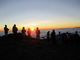 私は、昨夜は暑く寝苦しかったが、よく眠れたという人もいた。5時前には全体がザワつきだし起きる。ご来光を見にサンダルを突っかけて外に出ると、風は冷たく、ヘリの輸送準備がしてある物影でご来光を待つことにする。若い人がこっちにやって来た。一緒に座るのかと思っていると、突然足元を指して、その緑の私のです、返して下さいと言う。見るとA氏の履いているサンダルは備え付けのサンダルの色とは違う。A氏はサンダルを脱いで渡してしまい、若い人は一緒に玄関までとも言わずサッサと持って行ってしまった。