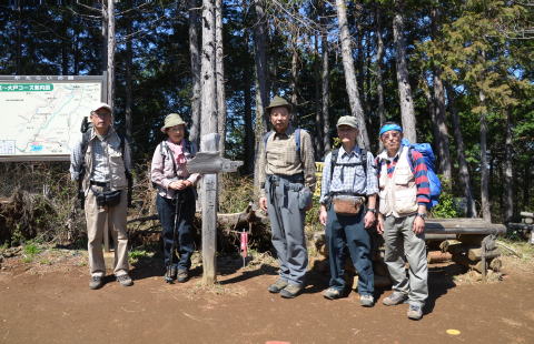 11:10、ベンチのある泰光寺山(475m)で昼食、中嶋さんからアルコールが振舞われる。