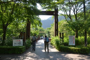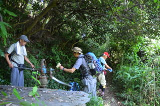 富士見台からは道標まで戻り一気に下り、城山へ上り返す。大天守閣跡‐詰の城を経由、坎井(かんせい:標高420m)。今でも汲める冷たい水に感激。八王子神社脇を通り松木曲輪へ。大きな石碑2個、眺めの良いところで小休止(10分)。八王子神社へ戻り、石段を下り柵門跡までの山道。金子丸(金子三郎右衛門家重が守備した曲輪)から道が広がる。歩きながら、木村さんの講義(八高線金子駅、金子一族の活動、等)。その後、看板、鳥居のある八王子城跡自然公園入口、エントランス広場を経て管理棟へ。ここからタクシーを呼び、高尾駅北口へ。久家さん以外の4名は「ふろッぴィ」にて汗を流す。 (記録:中嶋)