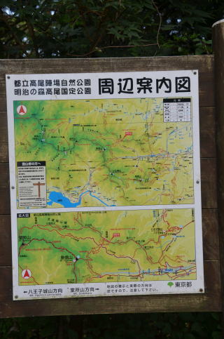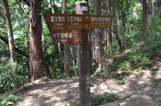 小ピークを過ぎ鞍部で立ち休み。板当峠(地図看板あり)。看板に正対すると東西が逆。注意書きあり。数十mの林道歩き(滝ノ沢林道)山道へ。高ドッケを経て鞍部で4分ほどの立ち休み。杉沢の頭(547m)にて4分ほどの立ち休み。富士見台着12:12。すれ違ったのは2組3名のみ。ベンチ・テーブルを占拠して昼食。