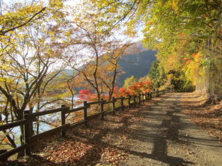 14:30 奥多摩湖湖畔の周回道路に出る。平坦な周回道路を進む途中で紅葉をバックに写真撮影。