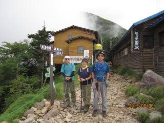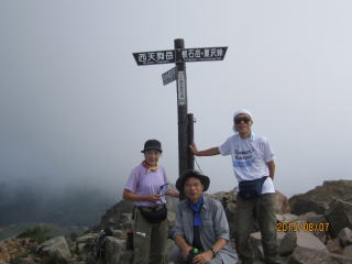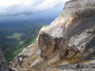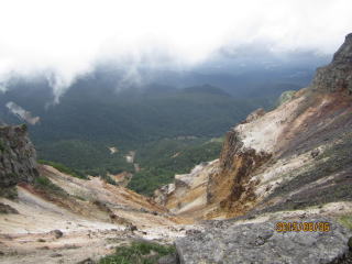 最小限の荷物でオーレン小屋を出発した。健脚二人のスピードには気にせずマイペースで進む。夏沢峠あたりはガスが立ち込めていた。山小屋情報ではここ毎日雷雨が発生していると言う。4時頃までに戻れば心配ないらしい。途中硫黄の臭いがしてきて山頂が近いようだ。1時間半弱で硫黄岳山頂に到着した。ガスがかかっていたが、赤岳や阿弥陀岳、横岳も見えた。硫黄岳の凄さは、山頂の南北両側に断崖絶壁の爆発火口跡が谷底深くあることだ。自然の怖さが想像できた。