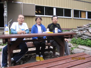 6:30の出発時、同宿の30人ほどの高齢者パーティと一緒になり、小屋の前で準備体操を始めたので合流させてもらい、終わるとパーティはコース別に3班に分かれて出発した。