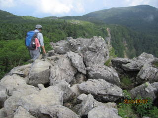 朝9時を過ぎると東天狗岳頂上には人も増えてきた。先生に引率された高校生一団から若さと元気をもらいながら中山峠へと向かった。あとは下るのみと安心したのがいけなかった。このコースは岩場の連続でかつ昨夕の雨で岩肌が濡れて滑りやすく注意を要した。私は二度も岩に滑って転倒してしまった。用心に用心を重ねながら降りてきた。私の体験した山行の中で最も難所のように思え、緊張感をともなった。
