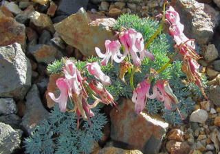我々は後から出たが途中で追い越し、そのまま進んだ。昨夕の雨で道も草木も湿っていて最近雨のない東京人には気持ちが良かった。箕冠山に着くころから朝日がまぶしくサングラスをかける。これから登る根石岳、天狗岳がはっきりと目の前に見えてくる。稜線、山肌までもが下からよくわかる。根石岳に登る山道の左右に青いロープが張られているがその理由がすぐに解った。ロープの内側は岩と砂礫で、至るところにコマクサのピンクの花が咲きそろっている。踏まれないように保護されているのだ。コマクサは時期的には盛りが過ぎているのか馬の顔形がちょっと貧弱に見えた。