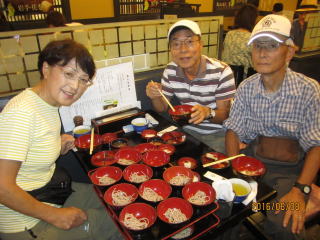 門馬さんから40杯が分岐点、40杯以上食べるなら② それ未満なら➀の解説あり、鈴木さんは即座に➀ 私もゆっくり味わいたいからと同じく➀を選択、結局3人はそろって➀を注文した。結果は一人平均30杯で2,500円の支払いとなりました。ついたてを挟んだ隣の席からはわんこを注ぐお姐さんの「ハイハイ ドンドン」とか「ジャンジャン」という掛け声が聞こえてきて見ると60杯を食べきったオジサン二人は汗だくでした。