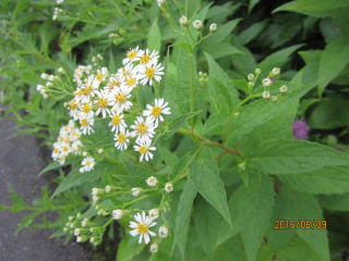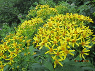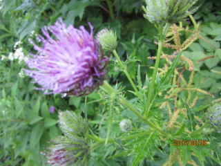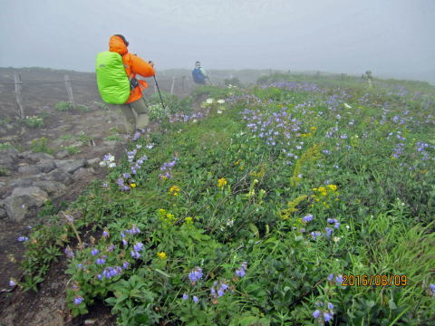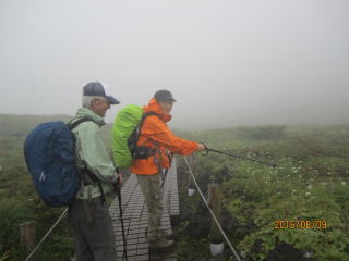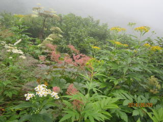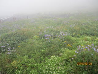 登山届を出し、最初の目的地、片倉岳展望台を目指す。樹木や植物が豊富で湿った木や草が体に絡みついてくる。上衣に雨具を着て良かった。最初の高山植物はアザミの花、紫の色が綺麗だった。数メートル先はぼんやりしているが、白、黄、青の花があちらこちらに。チングルマ、ハクサンシャクナゲかなと言いながら歩いた。写真を撮りながら進むとボヤーッと人影が見えた。案内標識をみたら片倉岳展望台だった。ここが展望台? 晴れていたら見事な景色を眺められたが残念。