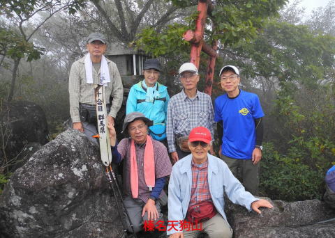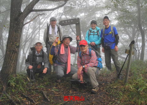 更に約1時間で今日の目的地天狗山東峰に到着する。頂上は大きな岩が散在する。残念ながら雲の中で展望は全く望めない。各々好みの岩に陣取り昼食となる。霧がかかり始め、雨粒も混じる。その後、幸いに本降りにはならなかった。