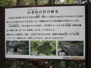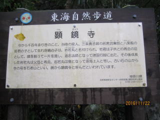 15分ほど進むと顕鏡寺に到着するが途中には風化した巨大な露岩がいくつも見られた。この付近の地層は第3紀層の礫岩で石老山の由来はこれらの巨岩によるものと説明されていた。平安時代初期の創建とされる顕鏡寺の名前の由来は寺を開山した源海法師が幼少のころ、諸国行脚に出る父道志法師と別れるときに再開の証として割った鏡の一部を渡されたという故事によるとされている。寺には源海法師が住居としていた岩窟もあり、歴史ある山寺の雰囲気が漂っていた。