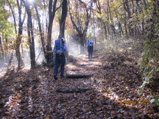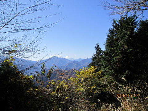11時山頂到着702m、絶好の秋晴れ、そして風もない。雪をカブった富士山が大室山と御正体山の間にきらきらと輝いて見える。それを我々3人だけが貸切状態で満喫している。スタートしてから誰にも会わず、素晴らしい紅葉の世界、木々に注がれる光、紅葉のじゅうたんといい、改めてこの日を決断された門馬リーダーに感謝せずにはいられなかった。時間が早いので頂上では記念写真だけ撮り、昼食は先の大明神展望台でとることにした。