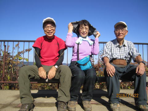 途中の電車の乱れはあったがそれでも3人は計画通りの時間に相模湖駅到着、その頃には雨もやみ晴れ間が見え始めていた。駅前から三ケ木行バスに乗ること15分、バス内で門馬リーダーから久家さんからのお手紙と松本土産を3人でありがたく共有する。バスは石老山入口で下車、ここが標高205m、天空は雲を追い払い快晴の域に入る。昨日からの雨で濡れた紅葉が陽に当たりまぶしくも感じる。702mの石老山に向かってまずは舗装された道路を川に沿って歩く。水の少ない川なのに幅だけは道の3倍もあると不思議がっていると右側に大きな精神科の相模湖病院が出てきた。患者さんだろうか、数人がこちらを見ていたが挨拶することもなく通り過ぎる。そして病院の脇から山道へと入った。