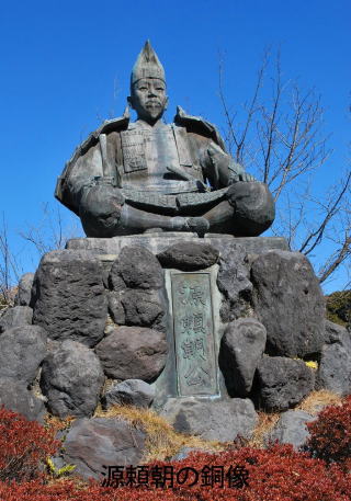 お昼頃になり、源氏山(93m)山頂で昼食にすることにした。源氏山に向かう途中に木々の間から、より大きい富士山が間近くに見えた。堂々とした頼朝公銅像の前を通り、源氏山に到着した。低い頂上だが、湘南の海が民家の屋根越しに見えた。