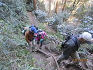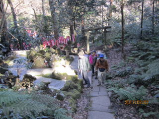 お昼を済ませた後は銭洗弁天へ。笊にお金を入れて洗い清めた。お金が魔物にならないようにと。下った先に出世開運の佐助稲荷神社、赤い鳥居のトンネルが印象的だった。お稲荷様のお使いのキツネが数多くあり圧倒された。ここ神社から尾根に上がるまでは、手すり付きのハードな急登だった。出世するのも簡単ではなさそうだ。