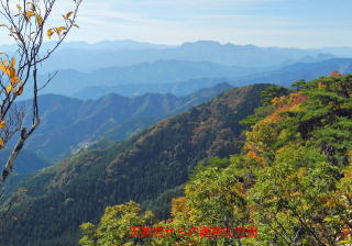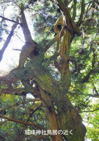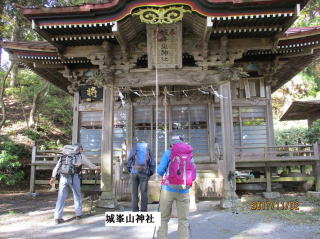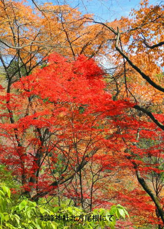 登り始めてから約1時間半で表参道鳥居前に到着する。杉林の中から急に平らな広場となり、お日様が眩しい。山の上の方は黄色や赤に染まっている。更に杉並木三百本を通ってゆくと城峰神社に到着する。太い杉に囲まれ鎮まりかえった境内に、日に当たり真っ赤に染まったもみじが映える。遠くの山々も今日は綺麗に見える。