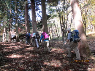 西武秩父駅へ到着。暫く待つとジャンボタクシーが到着し、ザックを荷物室に乗せ、6人が乗り込む。定員は9名とのことで、ゆっくりである。半納登山口まで約50分掛かるということで、久家さんから3つのお話をしたいという提案がある。1つ目は、今年の忘年山行を12月14日(木)とすること、場所は昨年と同じ長尾平とすることを了承する。2つ目は来年の1月の山行として、松本方面の1泊案と逗子、鎌倉方面の日帰り案が提案されたが、参加者が多い日帰り案で承認される。3つ目は久家さんが最近受けた高齢者運転者講習会の結果で認知症テストを100点満点で合格したとのこと。其の対策案を伝授される。