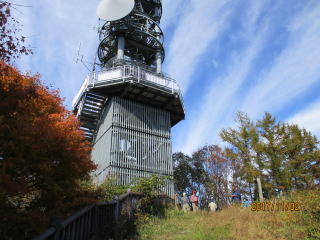 分岐に戻り、少しの登りで本日の目的地1038mの城峰山山頂に到着する。ここで今日初めて我々以外の登山者に出会う。一人の山ガールだった。頂上には展望台を兼ねた電波塔が立っていた。異常にデカい展望台だなと思ったが、360度展望可能なことから、電波塔としても最高の立地なのである。展望台に上り、暫く360度パノラマを楽しんだ後、各々日当たりの良いところに陣取り昼食をとる。展望台の周辺には沢山のパノラマ写真が掲示されており、多くの山名が記されている。遠くは筑波山や榛名山、浅間山が見えるらしい。近くの山名を見ると山久会で行った山々が結構入っている。