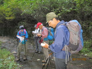 砂利の上に杉の小枝を敷き詰めたような歩き易い道であるが、余り人は入っていないようで、笹の枝がザックに引っ掛かり次の人に跳ね返る。右手の沢から水音が聞こえてくる。沢沿いに登る、上から見下ろすと小さな滝が有ったり溜まりが有ったりで、渓流釣りができそうである。登るに連れ沢は浅くなり、小さな橋で沢を右に渡り、いよいよ登りである。と言ってもそれほどの勾配ではない。登り始めてから1時間ほどのところで小休憩となり、例の塩羊羹を配る。私(佐々木)の山行記録を辿ると昨年の10月の榛名天狗山以来の山行であることが分かった。