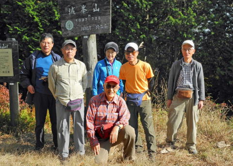 展望台から降り、城峰山の表示板の下で記念写真を撮っていると、例の山ガールが丁度降りてきて、写真を撮りましょうかと言ってくれた。しかし我々はいつもの通り合成ができるので、御断りした。