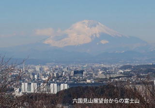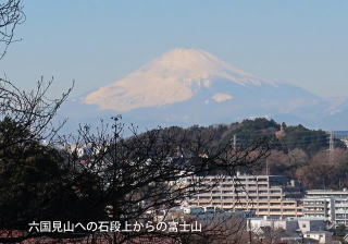 住宅街を抜けて六国見山、森林公園という標識から登山道に入る。今日は寒いけれど快晴の青空で振り返ると秀麗な富士山がくっきりと見え、山頂での眺望が期待できそうだ。