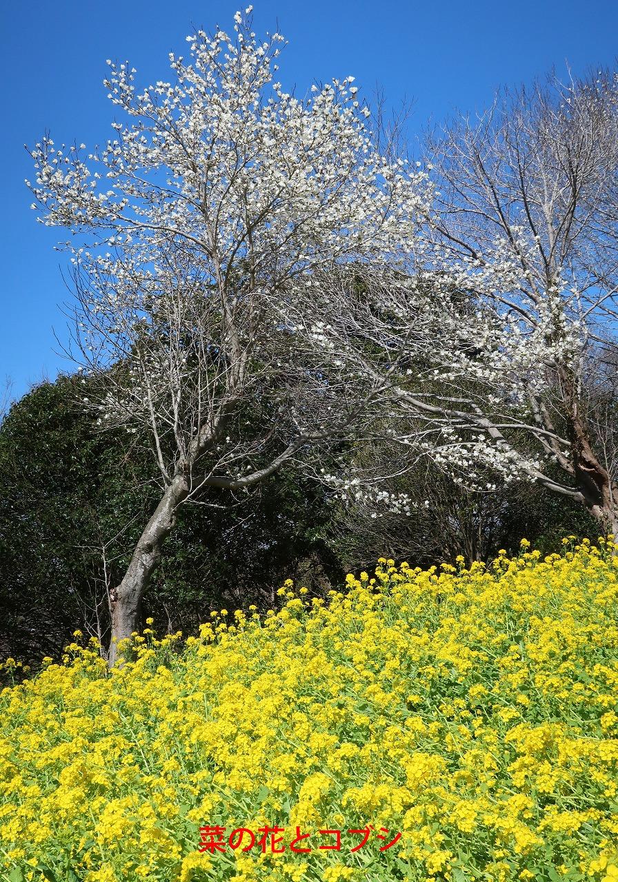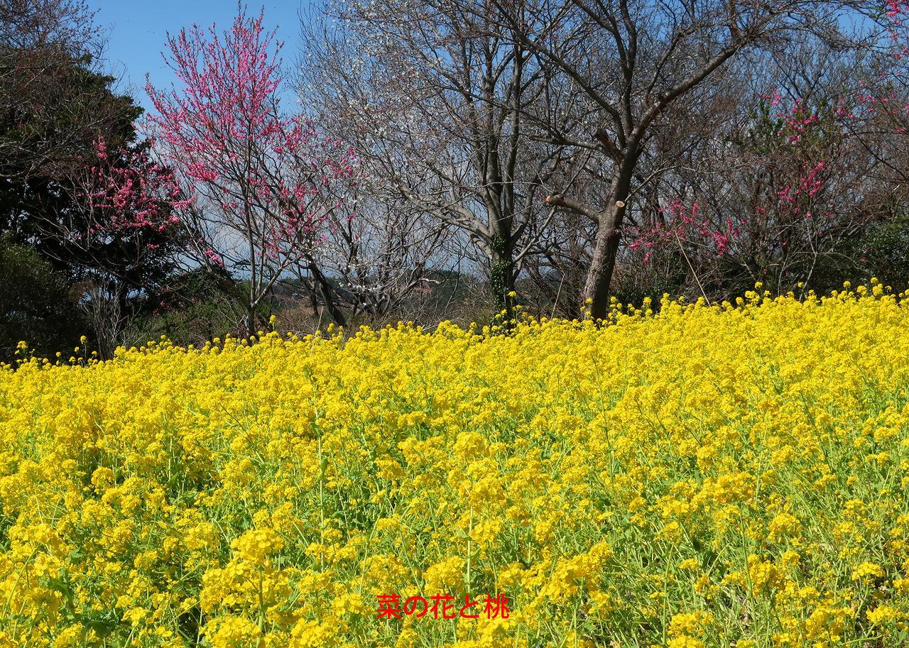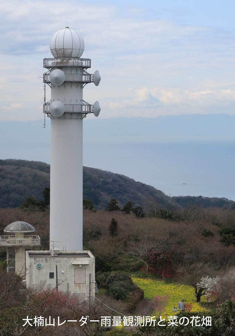 頂上の一寸下には白くて大きな灯台風の円筒状の建物がある。レーダー雨量観測所とのこと。その周りには菜の花が一面に咲いていた。真っ黄色の菜の花と白いこぶし、ピンクの桃、赤い椿と色合いが鮮やかで美しい。また、菜の花の香りを初めて満喫した。