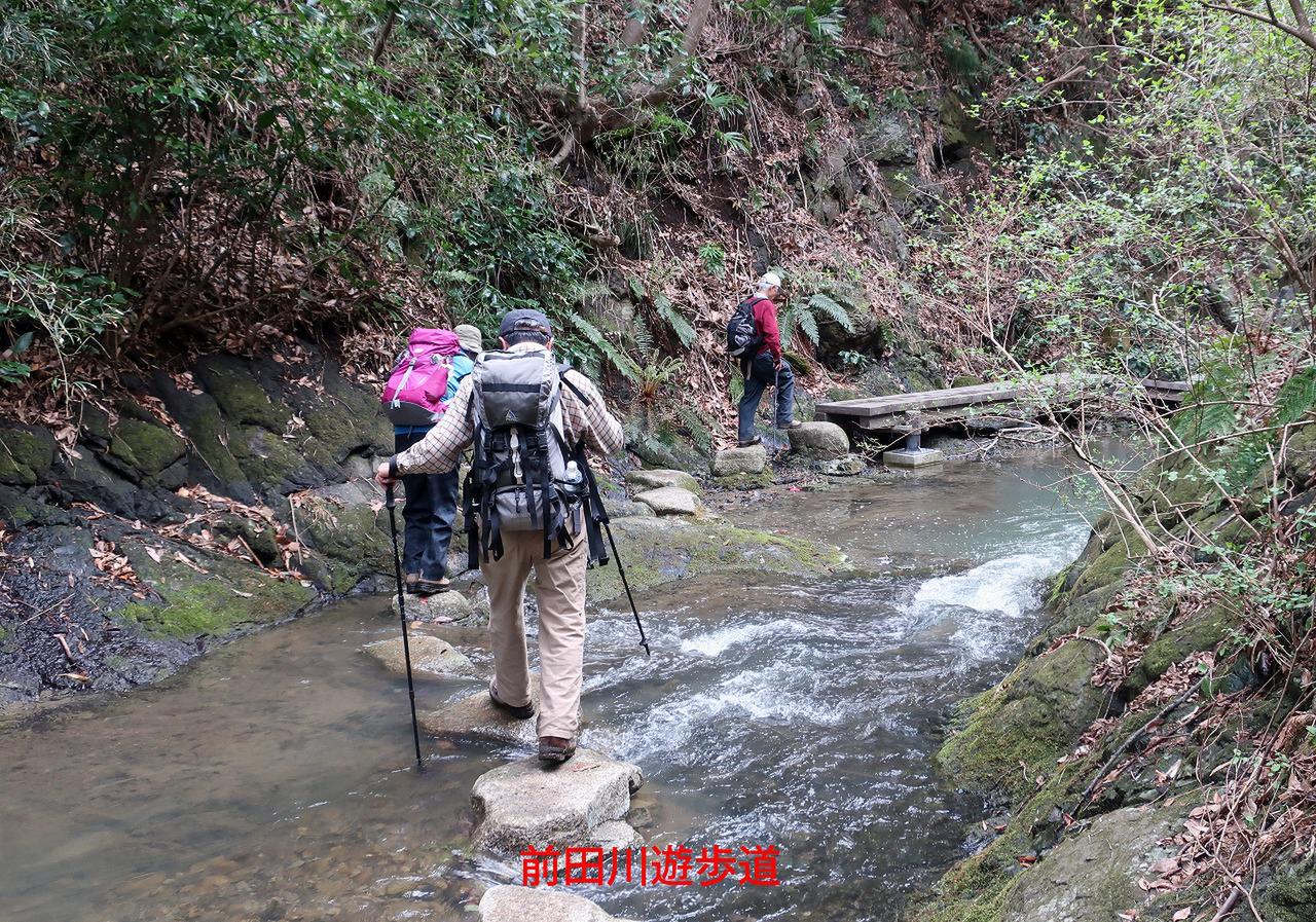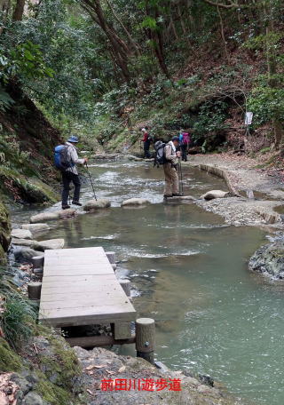 暫くぬかるんだ道を下ると、前田川遊歩道入口に到着する。前田川の川辺に木造の遊歩道と大きな飛び石が設置されていて、蛇行する川を右岸へ、左岸へと誘導し、下流に辿り着くというものである。7,8百メートルほどの距離があるとのことで、若干スリルがあり、面白かった。