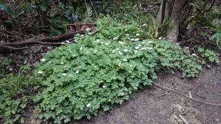 道端には、シダ類が茂り、ところどころには二輪草の白い花が一塊となり、椿の花弁が路上に散りばめられている。