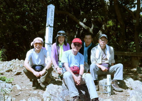 山頂でいつもの写真も撮り下山開始した。大きな岩に向かって直進した。さらに先に進もうと思ったが、落ち葉に覆われて、あまり歩いたような形跡がない。リーダーの判断で引き返すことにした。引き返したところ、黄色いロープが張られ大きくカーブした道があり、踏みつぶされたしっかりした道で正規な道と判断でした。安心して一気に下った。途中右に行く道もあったが、左に進んだ。後で女坂と分かった。途中、休憩した場所がトンビ岩の上だった。地元の年配の女性が軽装で軽快に登っていった。頻繁にくると言っていた。