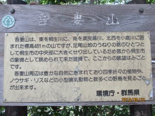 女吾妻までは緩やかな道で足取りも軽くなった。電車から見えた茶色の反射板のある女吾妻に到着した。低山に不釣り合いな大きなケルンや寒暖計(25度を示していた)、蝿たたきまで置いてあった。朽ちた木片に女妻48?(標高)とあった。
