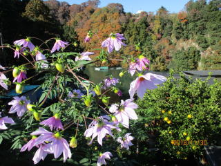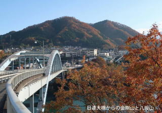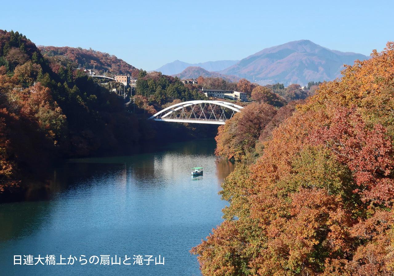 藤野駅で参加者6名が揃い、今日のリーダーである木村さんを先頭に歩き出す。直ぐに国道20号に出るが、車の往来が激しいにも拘わらず歩道がなく、道端を体を縮めて歩く。危険な道も「日連入口」の信号迄で、右折すれば車が少なくなる。日連大橋の手前でこれから登る金剛山や八坂山が正面に見える。今日は澄んだ快晴で、日連大橋の上から扇山や滝子山がよく見える。相模川の両岸は紅葉していて、快適な朝だ。