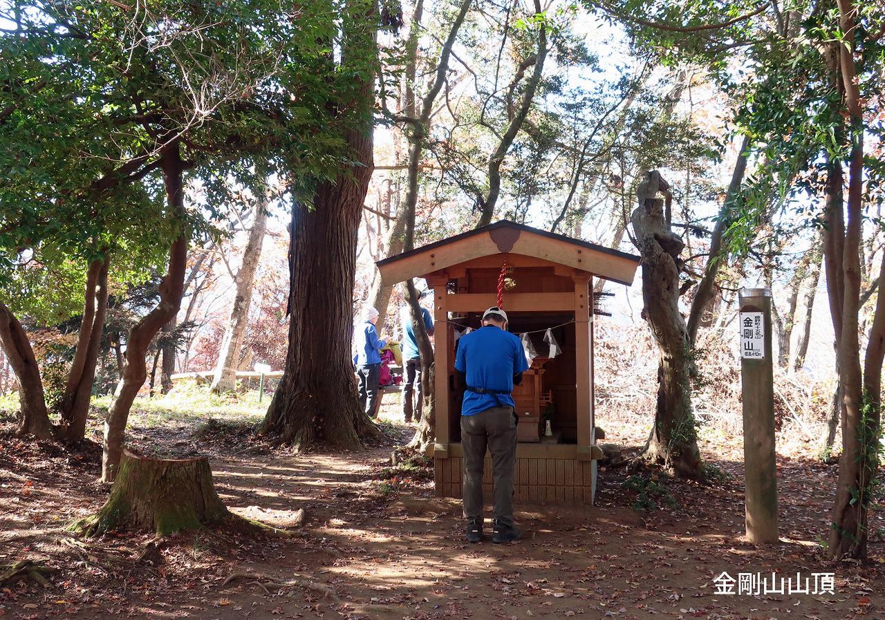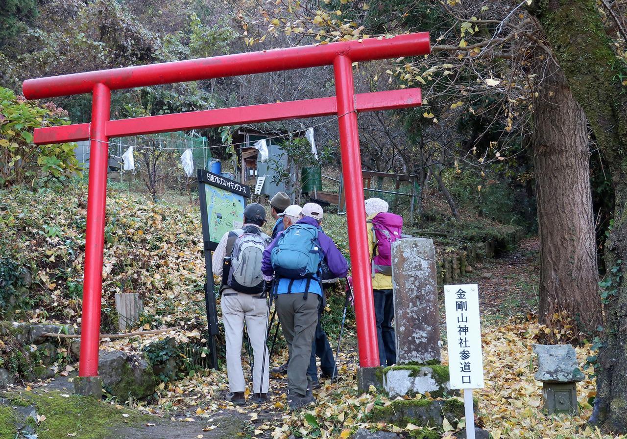 意外に早く金剛山登山口に着く。鳥居を潜ってから登り道になる。道はつづら折りになっているのできつくない。ただ、濡れ落ち葉が敷きつめられた状態なので、滑り易い。途中で振り返ると、眼下に日連大橋や5月に芸術の道からの帰りに渡った秋川橋が見え、その先には陣馬山が見える。金剛山山頂は広く、杉集落の火防(ひふせ、防火)を祈願する金剛山神社が鎮座している。ここで最初の休憩をし、佐々木さんから恒例の塩羊羹を戴く。