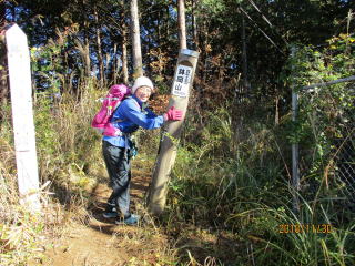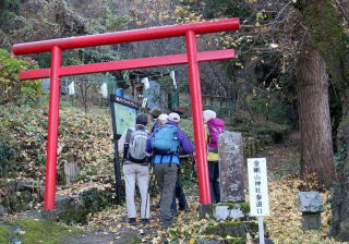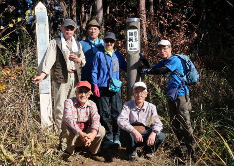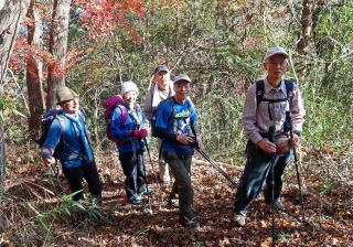 分岐に戻り東に進む。足元にもみじがちりばめられているので見上げると、紅葉したもみじが逆光に映えて美しい。新和田峠に進む巻道の入口にはロープが張られ、通行止めになっている。やがて、杉峠に着く。杉峠から、歩いてきた尾根の南斜面を巻いて戻るように進むと、新和田峠に着き、右下に新和田(あらわだ)の集落が見える。幅広の道を緩く登って行く。途中に鉄骨で作られた古い展望台があるので上がってみるが、周囲の伸びた樹木によって展望が妨げられている。やがて、道は細くなり急になってくるが、息が切れる前に本日の最高峰である鉢岡山山頂に着く。周囲の展望はなく、防災無線の中継塔が立っている。また、「鉢岡山烽火台跡」の標柱が立っているが、その説明文はない。陽当たりの良い所に各自腰を下ろして昼食にする。食後に今年の忘年山行の日と来年の山行を決める。記念写真を撮ってから下山する。