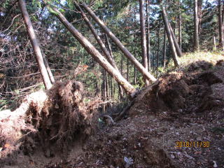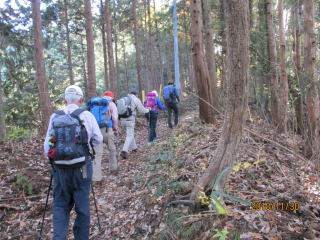 登ってきた道を引き返すのかと思ったら、木村Lは北方に下る。細い滑り易い道なので慎重に下る。途中に西方が開けた所がある。やがて、登ってきた道と合流する。杉峠に戻り、なおも東方に進む。小さなアップダウンをいくつも繰り返し、日連山に着く。下って登り返すと宝山に着くが道標はなく、三等三角点の石柱を見て宝山だと確認する。ここから僅か先で急勾配の下り坂になり、左右に張ってあるロープや立木に掴まって慎重に下る。本コース最難関の所で、ここだけはアルプスの名に相応しい。下りきった所がT字路になっていて、左に山腹を巻いて下る。傾斜が緩むと、日連登山口に出る。この後は舗装道路をだらだらと歩いて再び日連大橋を渡り、藤野駅に戻る。14分後の電車に乗る。
