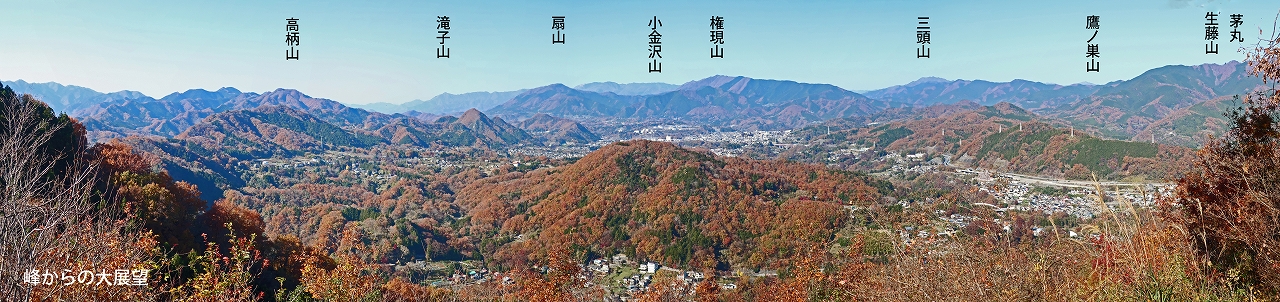| JR藤野駅南方の日連地区に位置する小規模アルプスで、中央線沿いから小金沢連峰に至る山々を同定したり、紅葉狩りしたりして、晩秋の低山登山を楽しんだ。 | |||