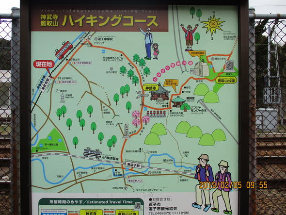 コース: 神武寺駅10:30--老人ホーム横10:50--神武寺山門11:10--最初の鉄塔11:35--鷹取山広場11:56〜12:32--鷹取山山頂12:37〜12:49--展望広場12:55--磨崖仏13:08〜13:15--追浜駅13:50