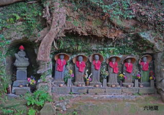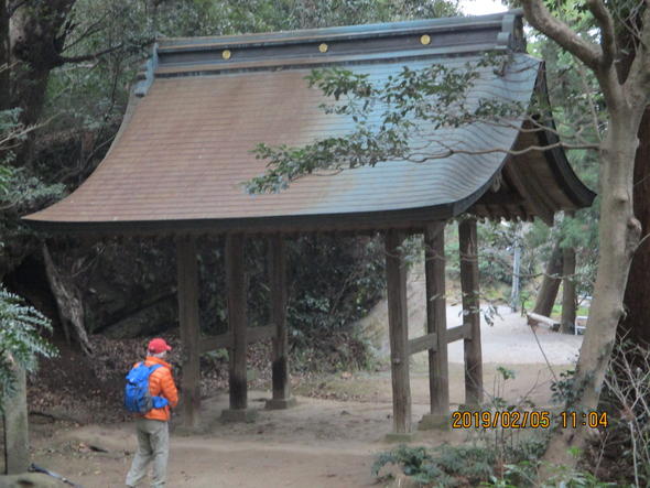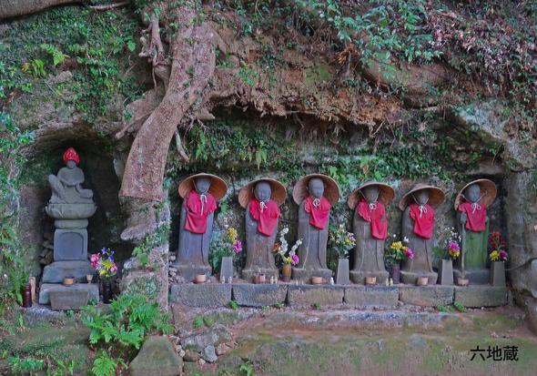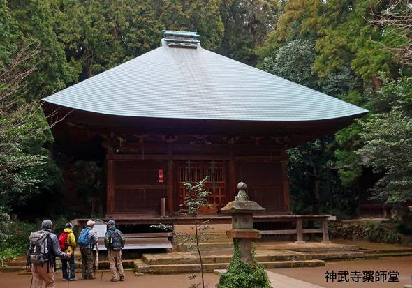 東逗子駅から神武寺に向かう参道を表参道と呼ぶのに対し神武寺駅からは裏参道という。ふぞろいに並んだ石階段やまわりの岩肌には苔が生えていて神武寺の周囲は鷹取山と同様、凝灰岩の岩場で囲まれ、岩肌の露出した日陰には、独特な植物が生育し、この辺りは岩隙植物群落と呼ばれているそうだ。緑がかった岩肌に落ち着きと静けさが感じられる