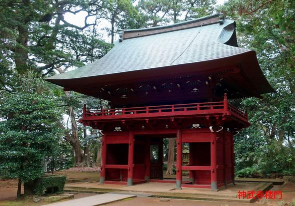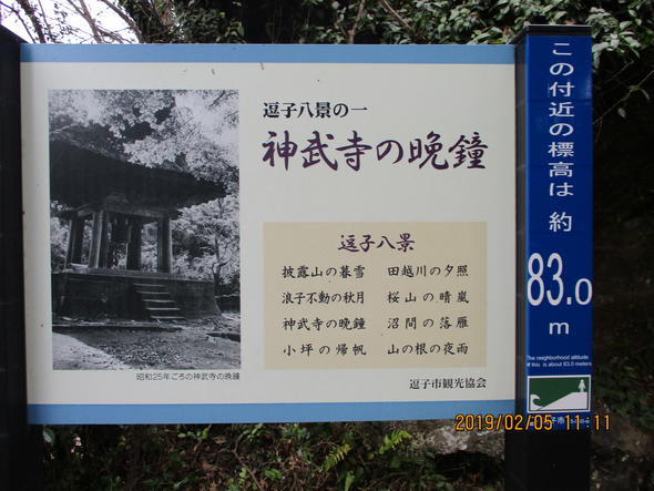境内を進むと岩壁の上に鐘楼があった。安政6年(1859)に建てられたもので、神武寺の鐘は、三浦半島八景のひとつに数えられていて梵鐘は第二次世界大戦で供出され、現在の鐘は昭和25年に鋳られたものと記されていた。