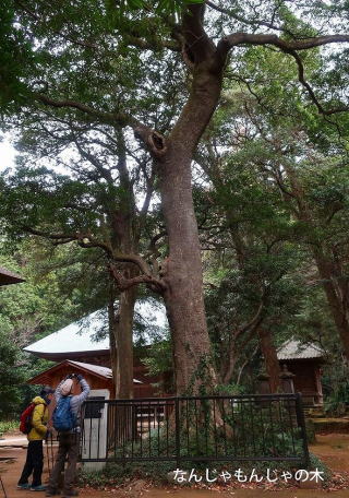 さらに階段を上がると薬師堂があり、1594年建立で室町時代末期の建築様式。本尊の薬師三尊像は秘仏で、正式の開帳は33年に一度、毎年12月13日の煤払いの日の午前中にも開扉されるという。そばにはホルト(別名、なんじゃもんじゃ)の大樹が柵に囲われてそびえ立っていた。高さ20m、樹齢400年ともいわれている。