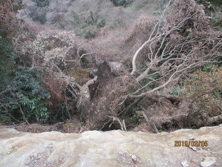 薬師堂の左側から鷹取山へ向かう急勾配の道は明治時代の初めまでは女人禁制で、山伏、修験者の荒修業の道場とあった。石段はどれも角が取れて丸みがあり、途中鎖場もあって、なかなか変化に富んでいる。岩場が多く、根が浅いせいだろうか、最近の大風で根こそぎ倒れている大木も目についた。