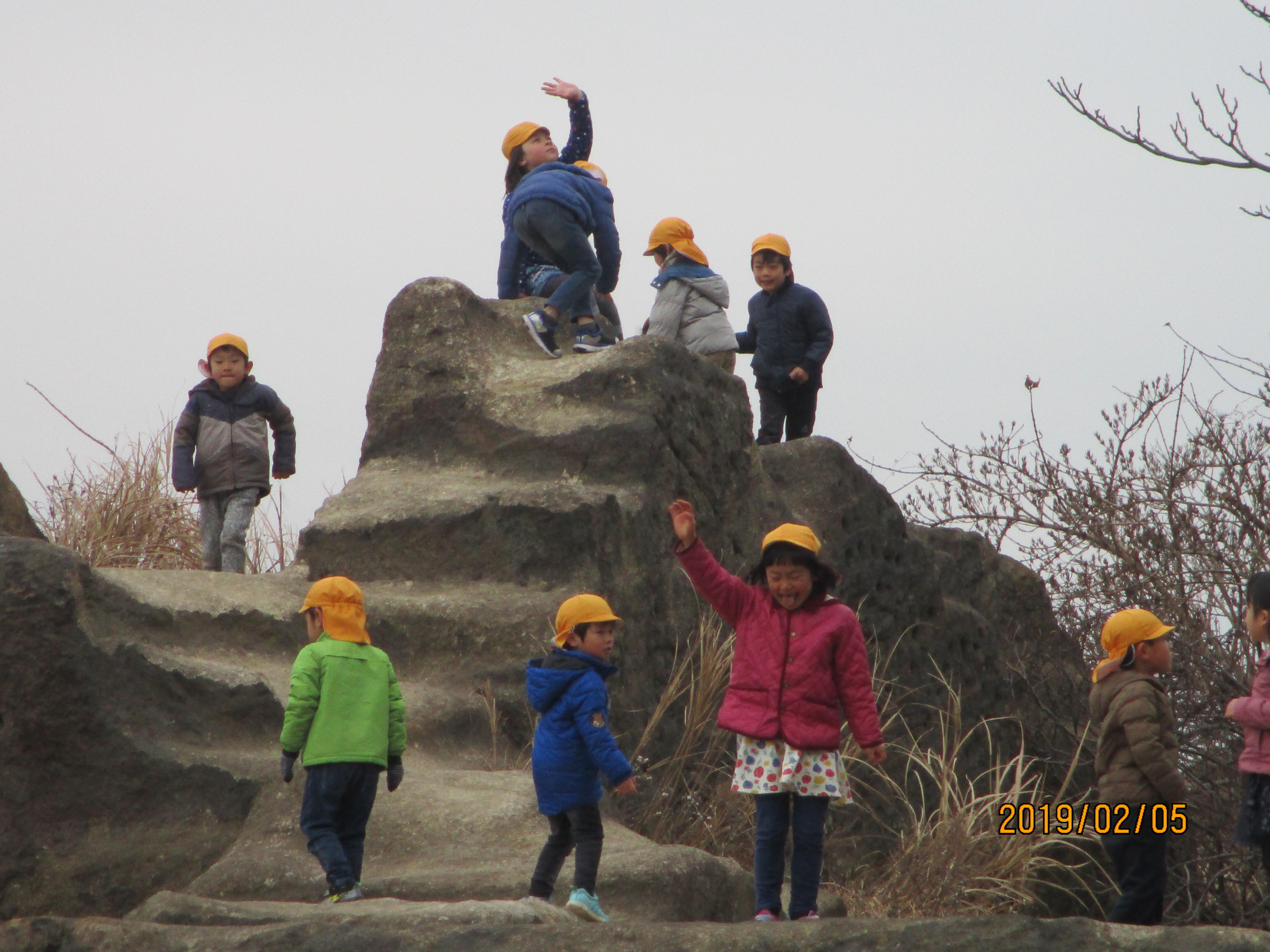 最高峰の頂上は階段をのぼった展望台の下だが山頂広場で昼食となった。すると近所の幼稚園児たちか、30人ほどの団体でやってきて広場内を走り出した。落ち着いて食事もできないほど動き回る、小さい頃からあんな岩登りを見てると皆なすばしこくなるんだなと思ったりもした。
